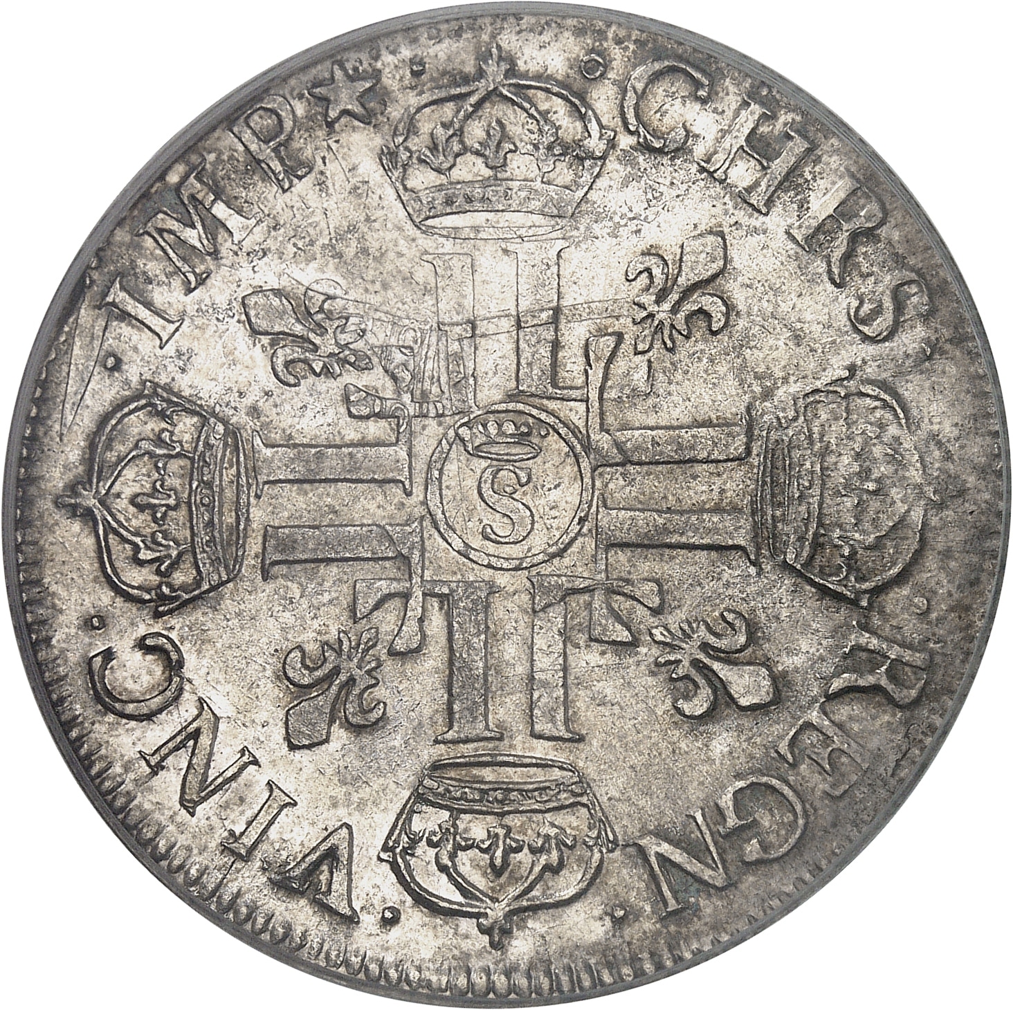 Rv. (à 12 h) (différent) CHRS. - .REGN. - .VINC. - .IMP (différent). Croix formée de huit L adossées, chaque bras étant couronné, avec (atelier) en cœur, cantonnée de quatre lis.