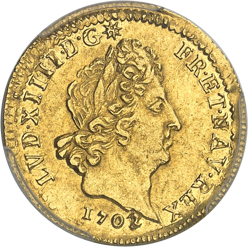 Av. LVD. XIIII. D. G (soleil) - FR. ET. NAV. REX. Tête laurée du Roi à droite, les cheveux courts ; (date) au-dessous.
