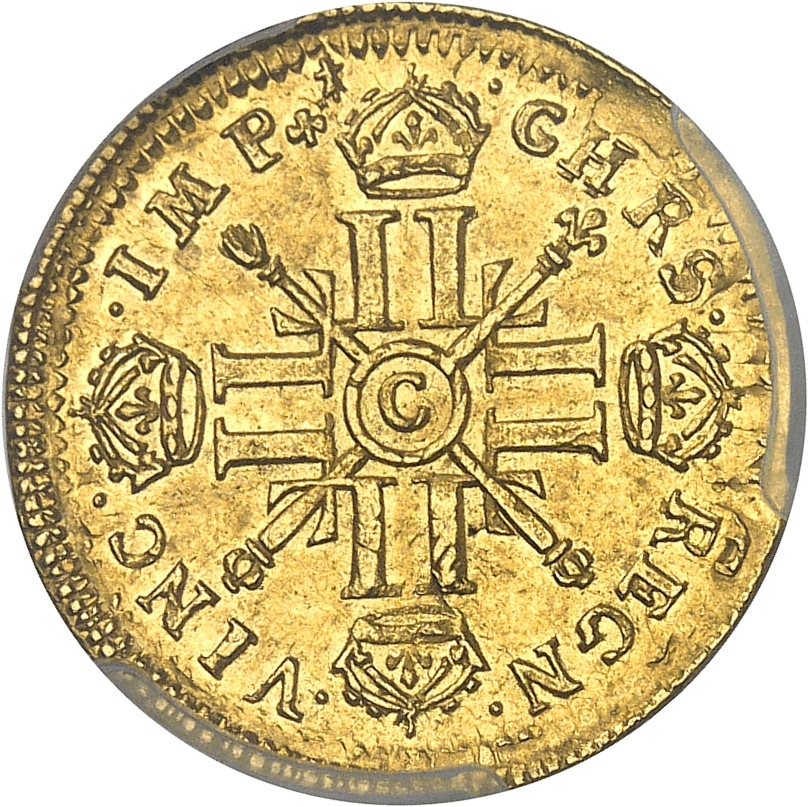Rv. .CHRS. - .REGN. - .VINC. - .IMP. (différents). Croix formée de huit L adossées, chaque bras étant couronné, avec (atelier) dans un cercle en cœur, brochant sur une main de justice et un sceptre posés en sautoir.