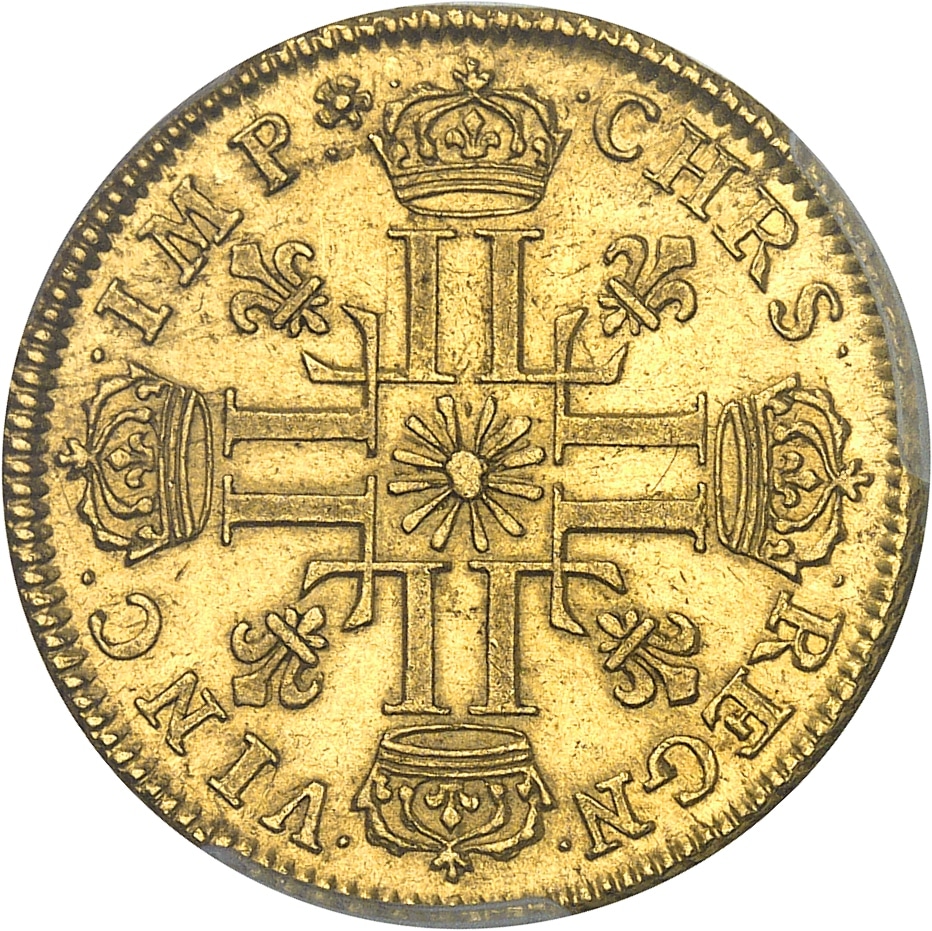 Rv. .CHRS. - .REGN. - .VINC. - .IMP (différent). Croix formée de huit L adossées, chaque bras étant couronné, avec soleil en cœur, cantonnée de quatre lis divergeant du centre.
