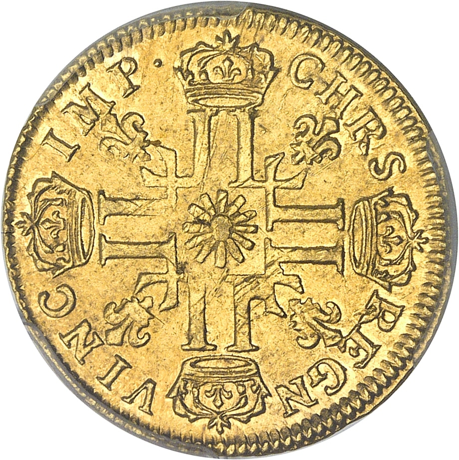 Av. (différent) LVD. XIIII. D. G (différent) - FR. ET. NAV. REX. Tête du Roi à droite, avec une grande perruque laurée, au-dessous (date) et (atelier).