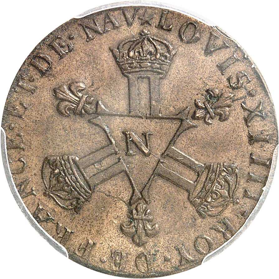 Av. (différent) LOVIS. XIIII. ROY. DE. FRANCE. ET. DE. NAV. Trois groupes de deux L adossées, chacun sous une couronne, posés en triangle, avec le différent d’atelier au centre, cantonnés de trois lis divergeant du centre.