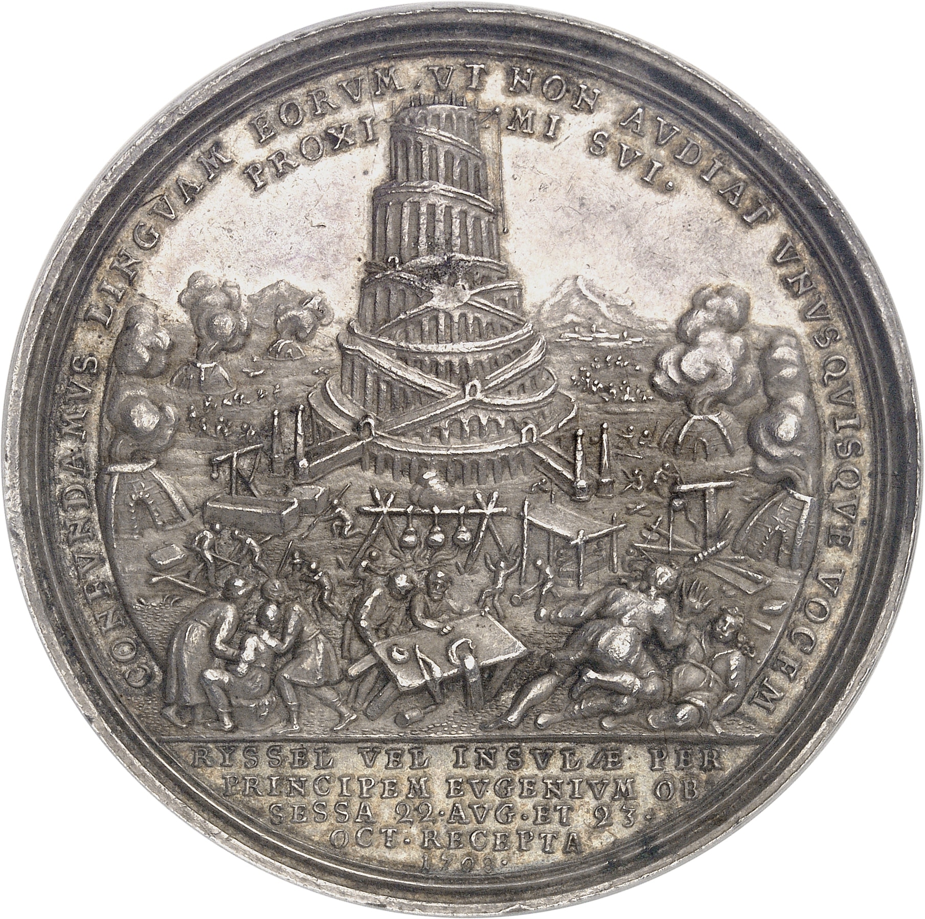 Rv. CONFVNDAMVS LINGVAM EORVM VT NON AVDIAT VNVSQVISQVE VOCEM// PROXIMI SVI. La Tour de Babel avec de nombreuses scènes de personnages ; à l'exergue : RYSSEL VEL INSVLÆ PER/ PRINCIPEM EVGENIVM OB/ SESSA 22. AVG. ET 23/ OCT. RECEPTA/ 1708.