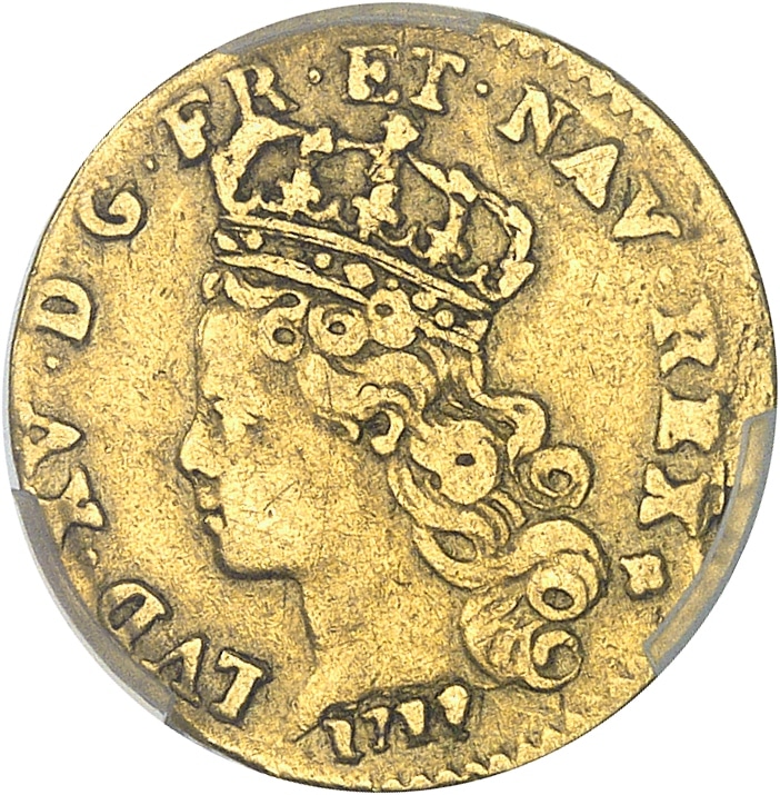 Av. LVD. XV. D. G. FR. ET. NAV. REX (différent). Tête couronnée du Roi à gauche, au-dessous (date).