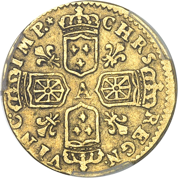 Rv. CHRS. REGN. VINC. IMP. (différent). Deux écus de France couronnés et deux écus de Navarre couronnés, posés en croix, avec (atelier) au centre, cette croix étant cantonnée de quatre lis divergeant du centre.