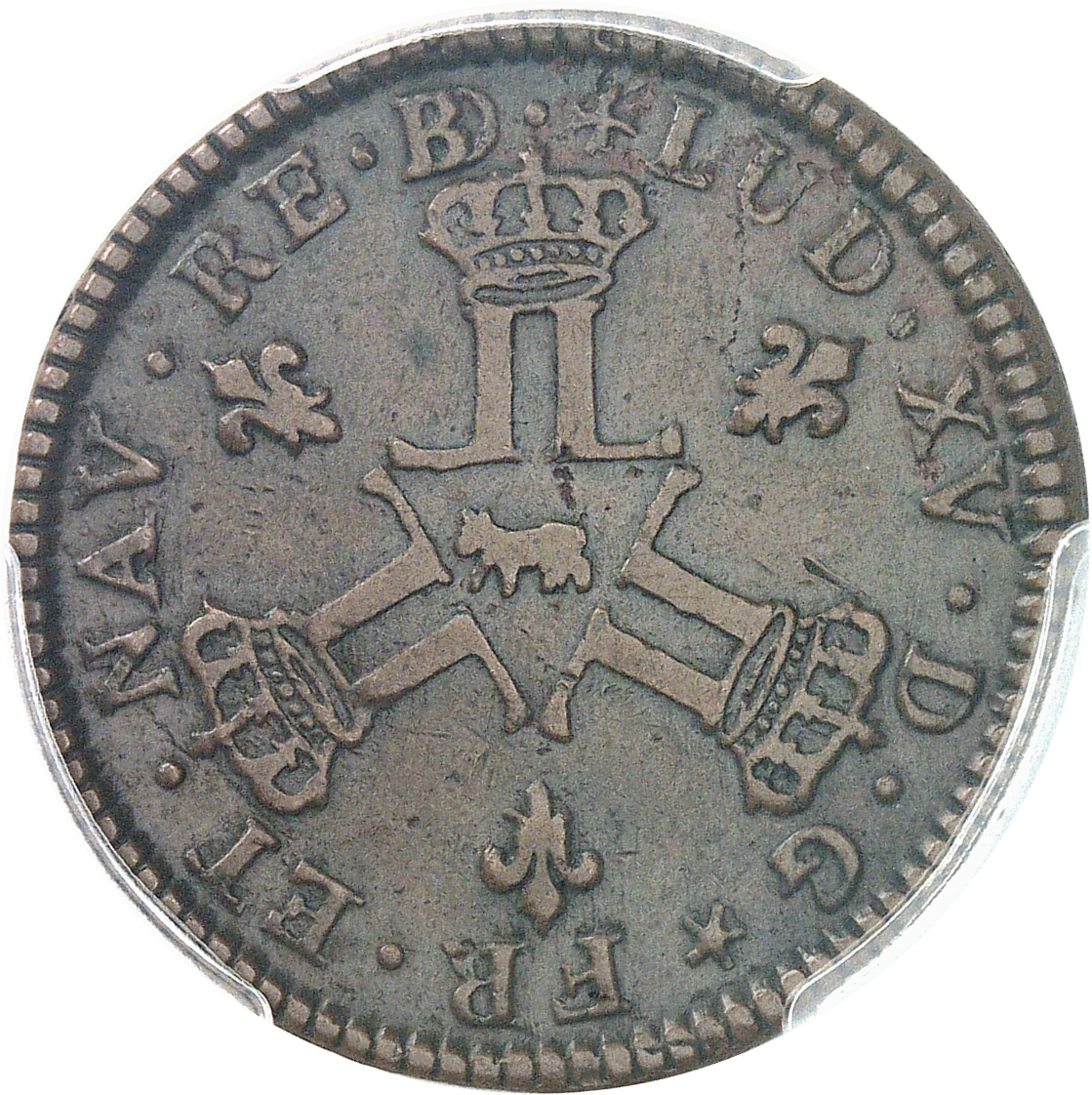 Av. + LUD. XV. D. G (différent) FR. ET. NAV. RE. BD. Trois groupes de deux L adossées, chacun sous une couronne, posés en triangle, avec (atelier) en cœur, cantonnés de trois lis divergeant du centre.