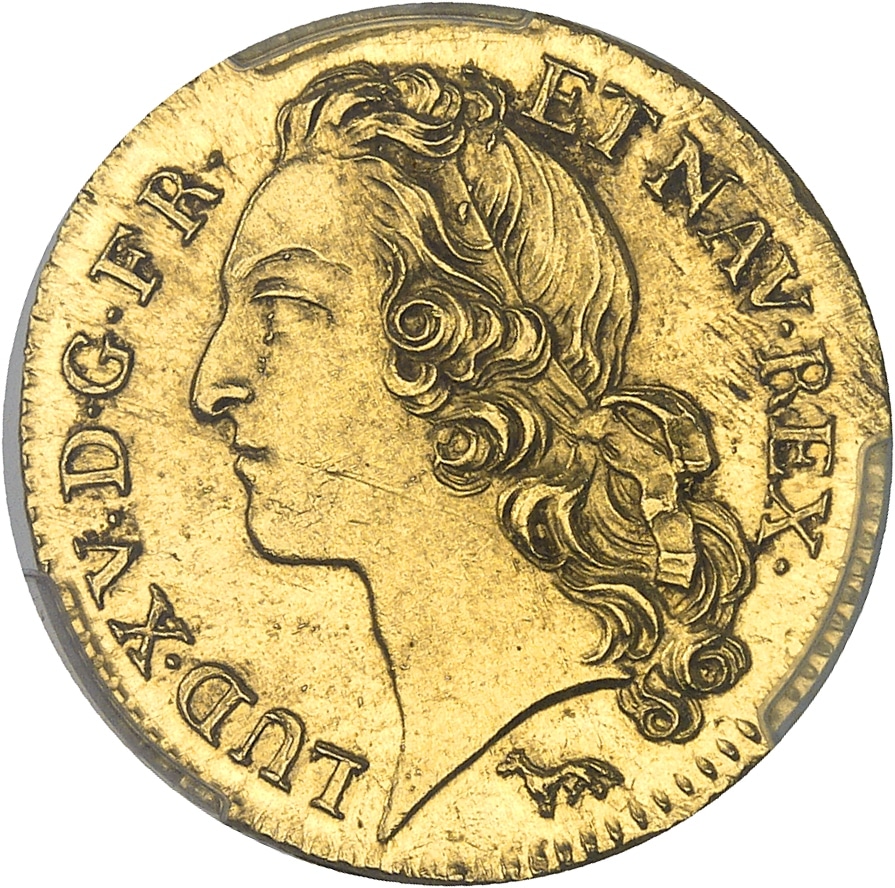 Av. LVD. XV. D. G. FR. - ET. NAV. REX. Tête à gauche du Roi, ceinte d’un bandeau, au-dessous (différent).