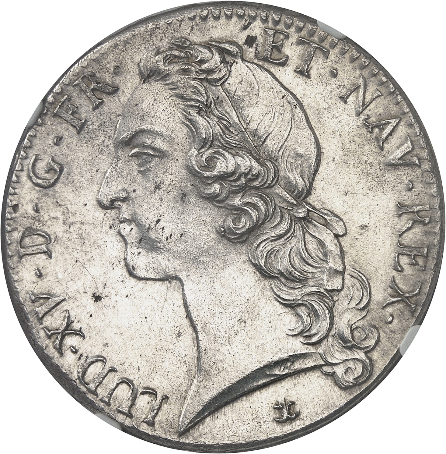 Av. LUD. XV. D. G. FR. ET NAV. REX. Tête à gauche du Roi, ceinte d’un bandeau. Signature JCR sur la tranche du cou ; au-dessous (différent).
