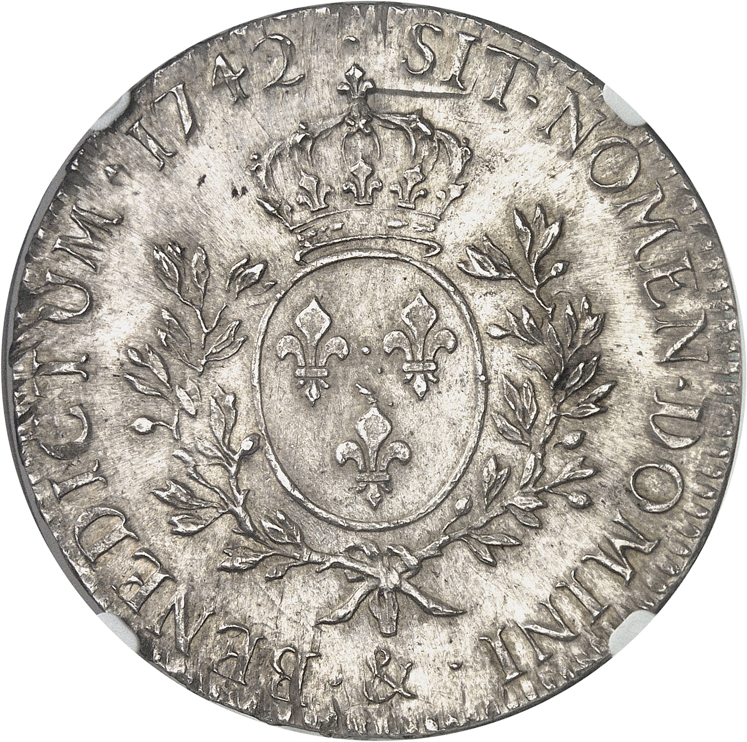 Rv. SIT. NOMEN. DOMINI. BENEDICTUM (différent) (date). Écu de France ovale, couronné, entre deux rameaux d’olivier ; au-dessous (atelier).