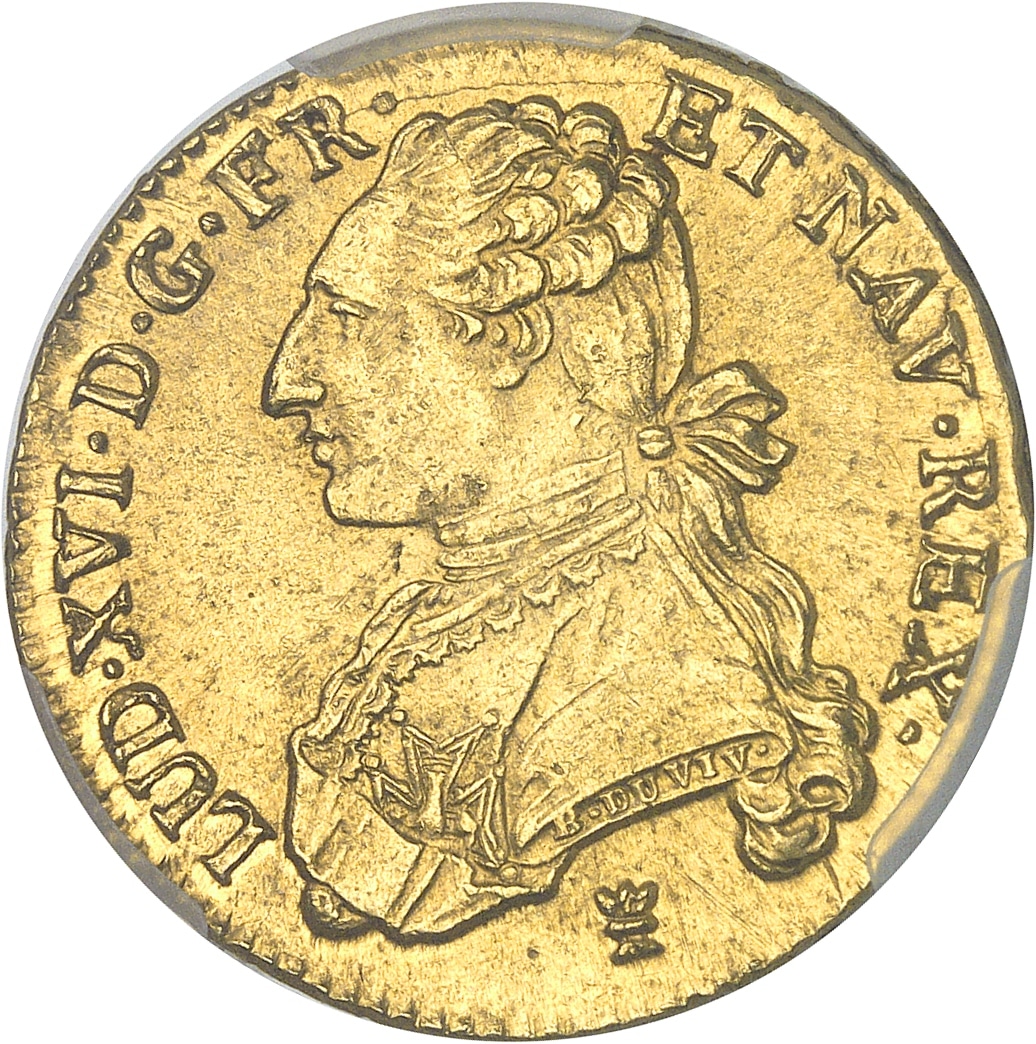 Av. LUD. XVI. D. G. FR. - ET NAV. REX. Buste du Roi à gauche, en habit brodé, avec l’ordre du Saint-Esprit, les cheveux noués sur la nuque par un ruban. Signature B. DUVIV. sur la tranche du buste ; au-dessous (différent).