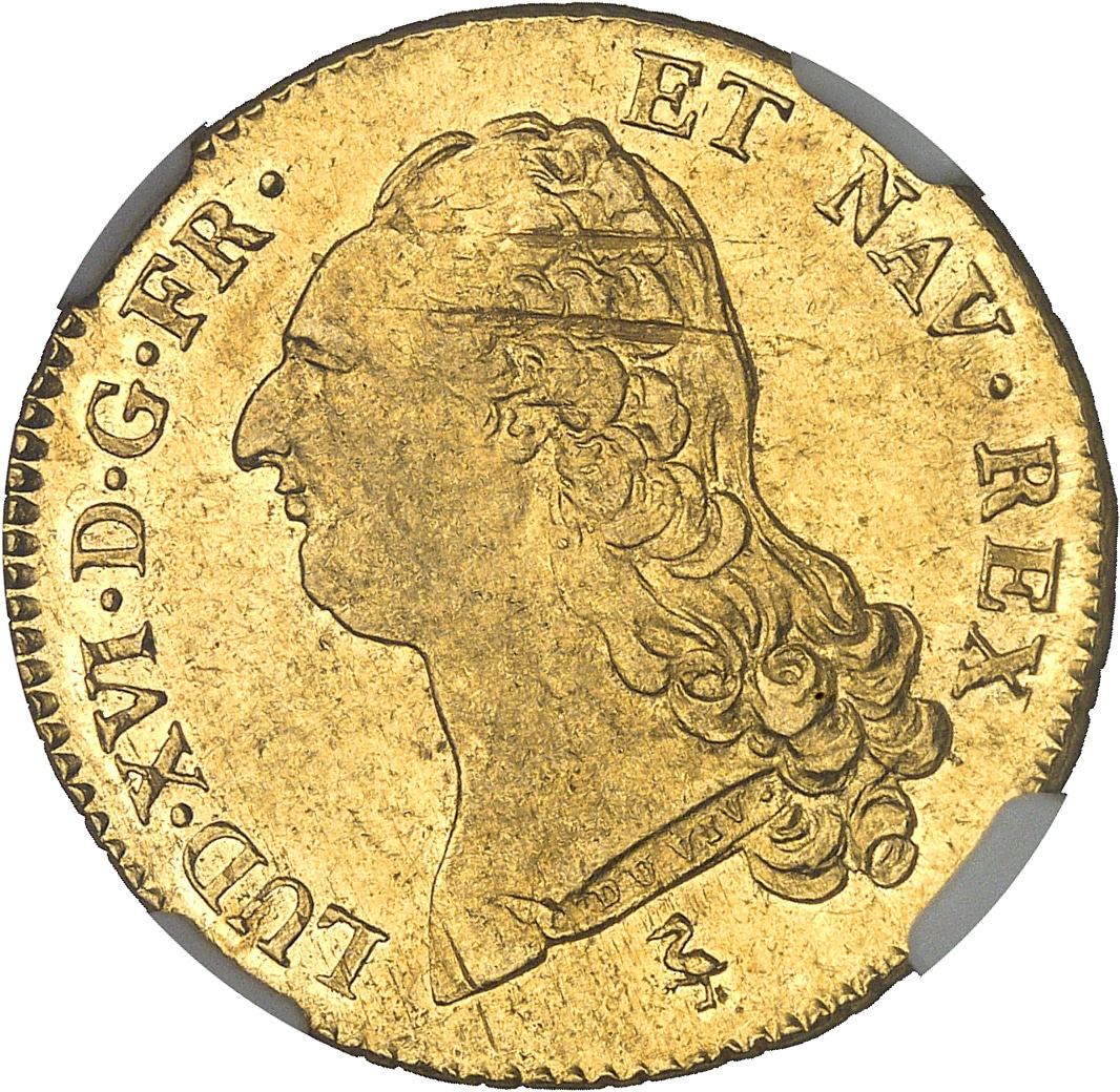 Av. LUD. XVI. D. G. FR. - ET NAV. REX. Tête nue du Roi à gauche. Signature DUVIV sur la tranche du cou ; au-dessous (différent).