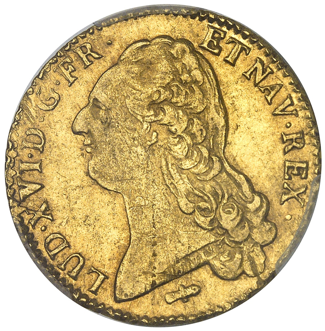 Av. LUD. XVI. D. G. FR. - ET NAV. REX. Tête nue du Roi à gauche. Signature DUVIV sur la tranche du cou ; au-dessous (différent).