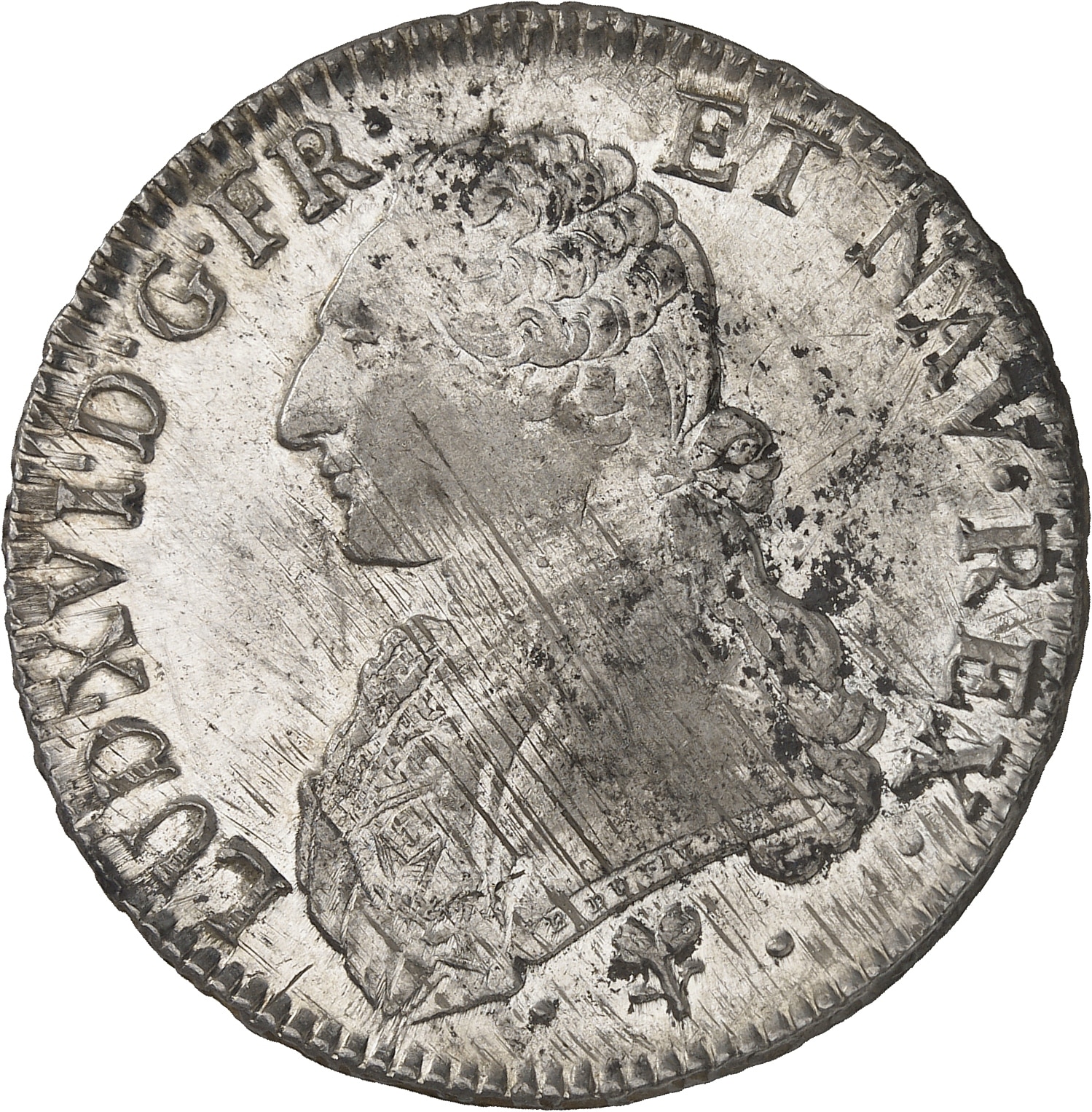 Av. LUD. XVI. D. G. FR. ET NAV. REX. Buste du Roi à gauche, portant une veste brodée, avec l’ordre du Saint-Esprit, les cheveux noués sur la nuque par un ruban. Signature B. DUVIV. F. sur la tranche du buste ; au-dessous (différent).