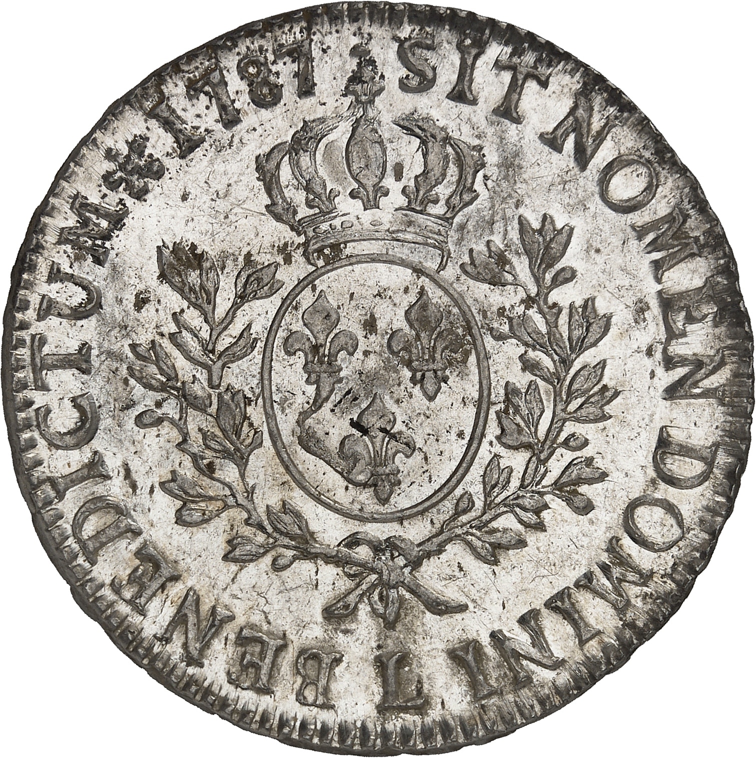 Rv. SIT. NOMEN. DOMINI. BENEDICTUM (différent) (date). Écu de France ovale, couronné, entre deux rameaux d’olivier, (atelier) au-dessous.