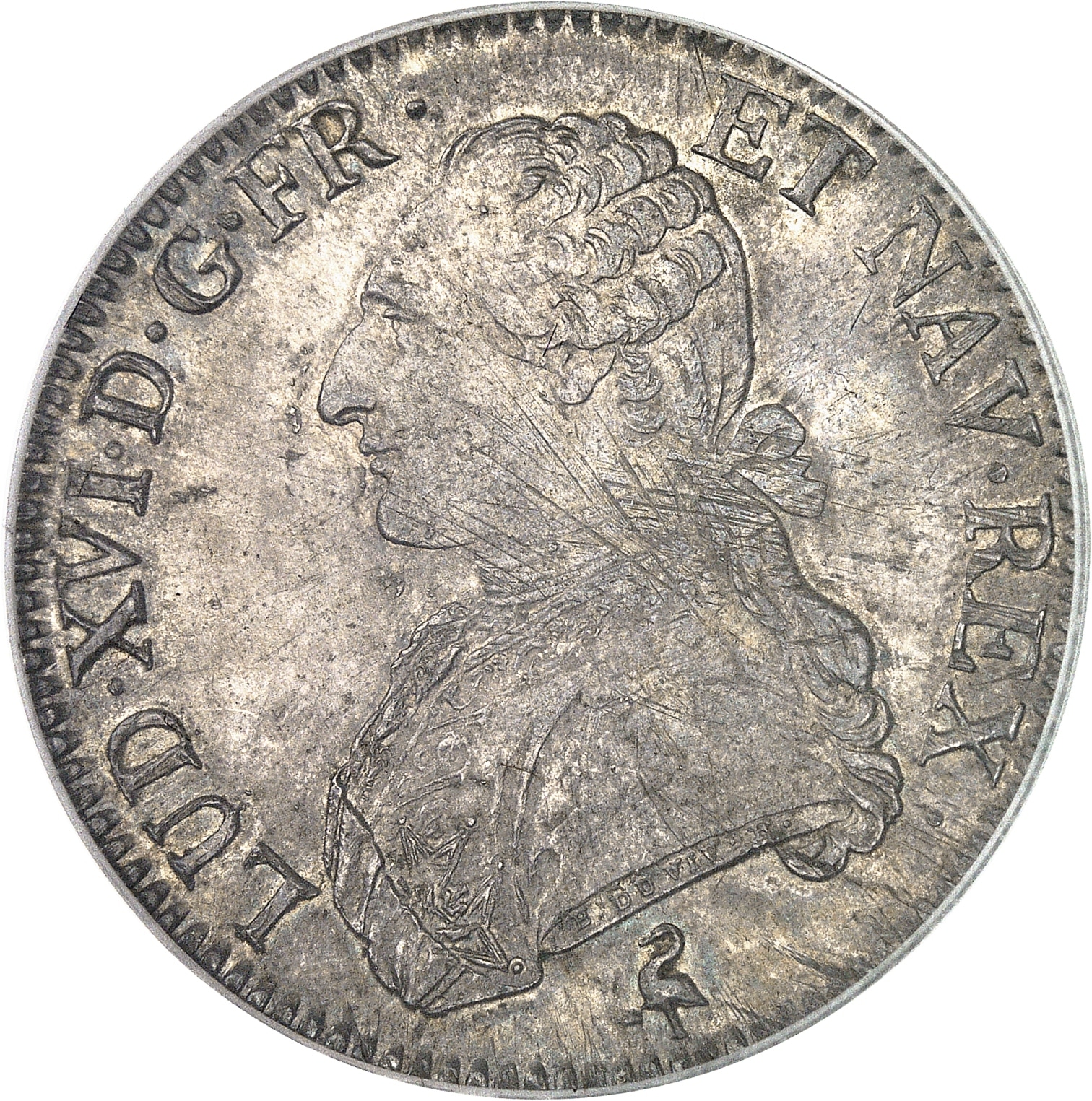 Av. LUD. XVI. D. G. FR. ET NAV. REX. Buste du Roi à gauche, portant une veste brodée, avec l’ordre du Saint-Esprit, les cheveux noués sur la nuque par un ruban. Signature B. DUVIV. F. sur la tranche du buste ; au-dessous (différent).