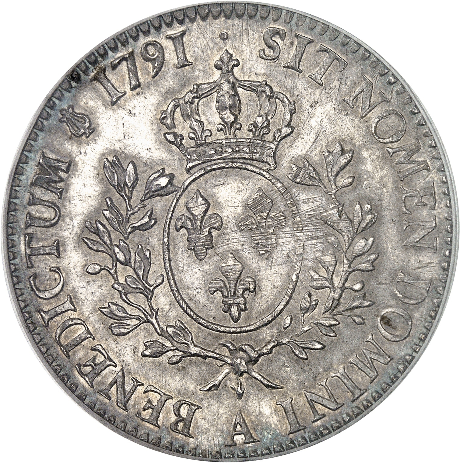 Rv. SIT. NOMEN. DOMINI. BENEDICTUM (différent) (date). Écu de France ovale, couronné, entre deux rameaux d’olivier, (atelier) au-dessous.