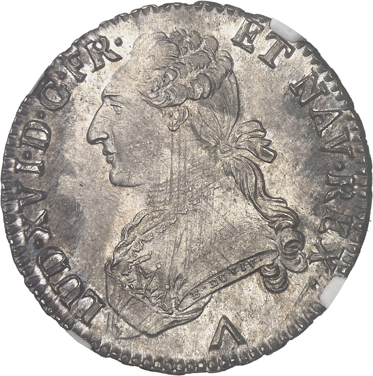 Av. LUD. XVI. D. G. FR. ET NAV. REX. Buste du Roi à gauche, portant une veste brodée, avec l’ordre du Saint-Esprit, les cheveux noués sur la nuque par un ruban. Signature B. DUVIV. F. sur la tranche du buste.