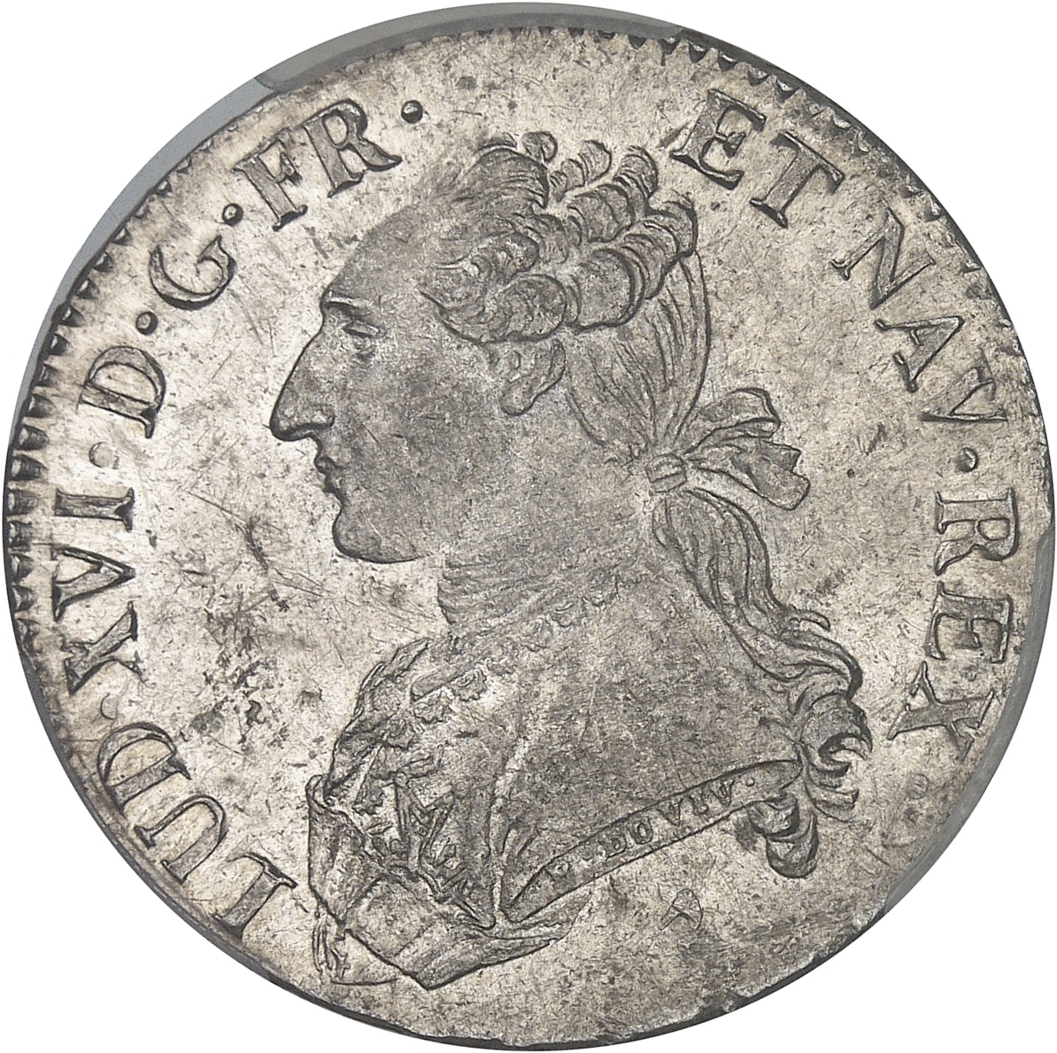 Av. LUD. XVI. D. G. FR. ET NAV. REX. Buste du Roi à gauche, portant une veste brodée, avec l’ordre du Saint-Esprit, les cheveux noués sur la nuque par un ruban. Signature B. DUVIV. F. sur la tranche du buste ; au-dessous (différent).
