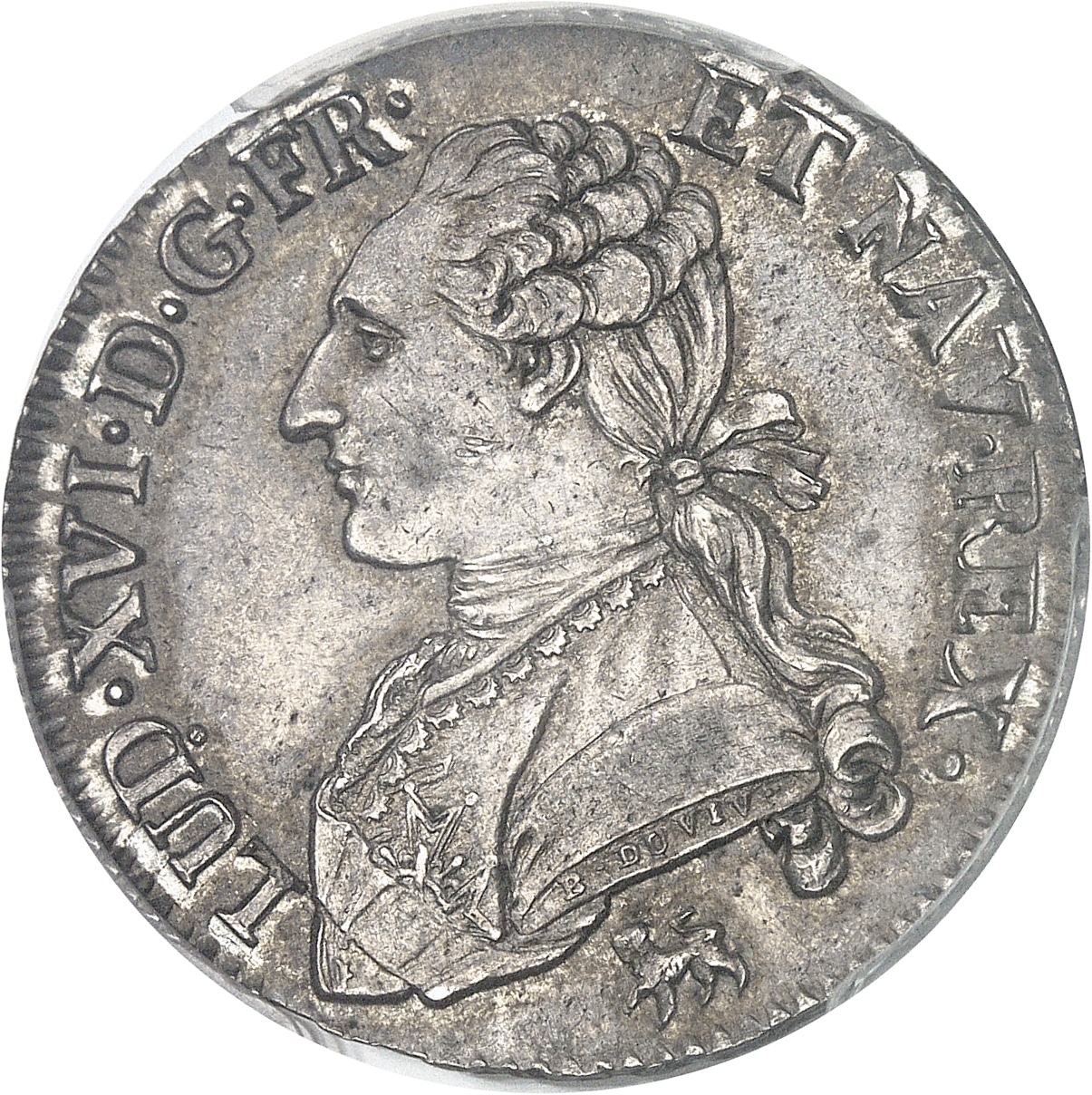 Av. LUD. XVI. D. G. FR. ET NAV. REX. Buste du Roi à gauche, portant une veste brodée, avec l’ordre du Saint-Esprit, les cheveux noués sur la nuque par un ruban. Signature B. DUVIV. F. sur la tranche du buste ; au-dessous, (différent).