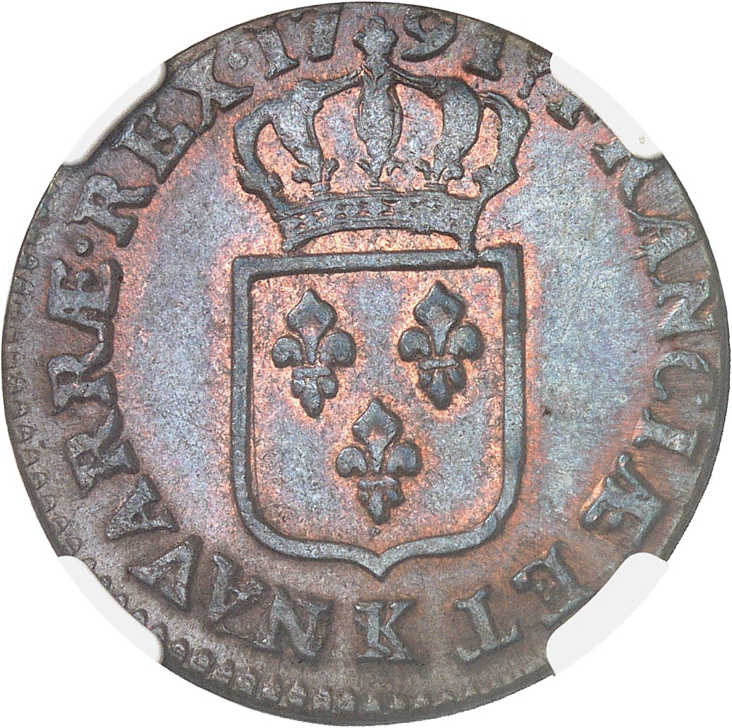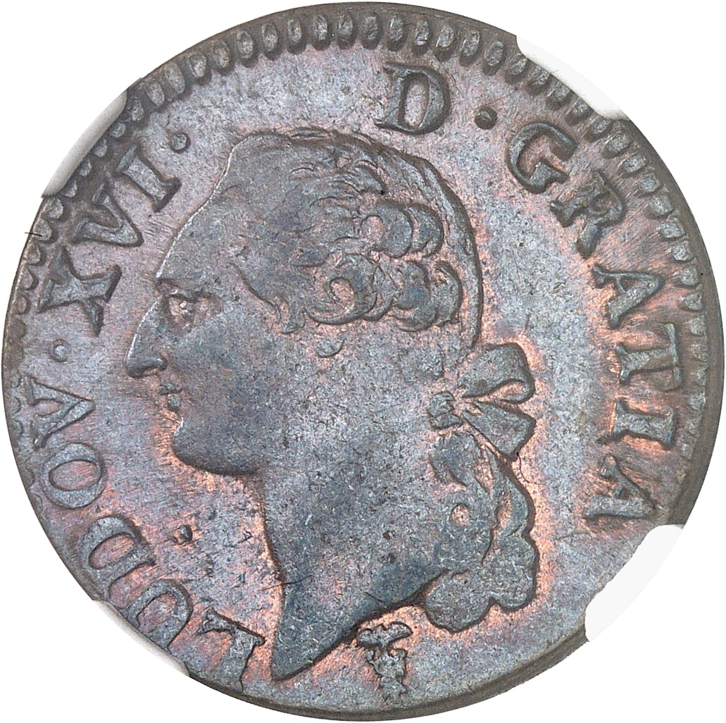 Av. LUDOV. XVI. - D. GRATIA. Tête nue du Roi à gauche, les cheveux noués sur la nuque par un ruban ; au-dessous (différent).