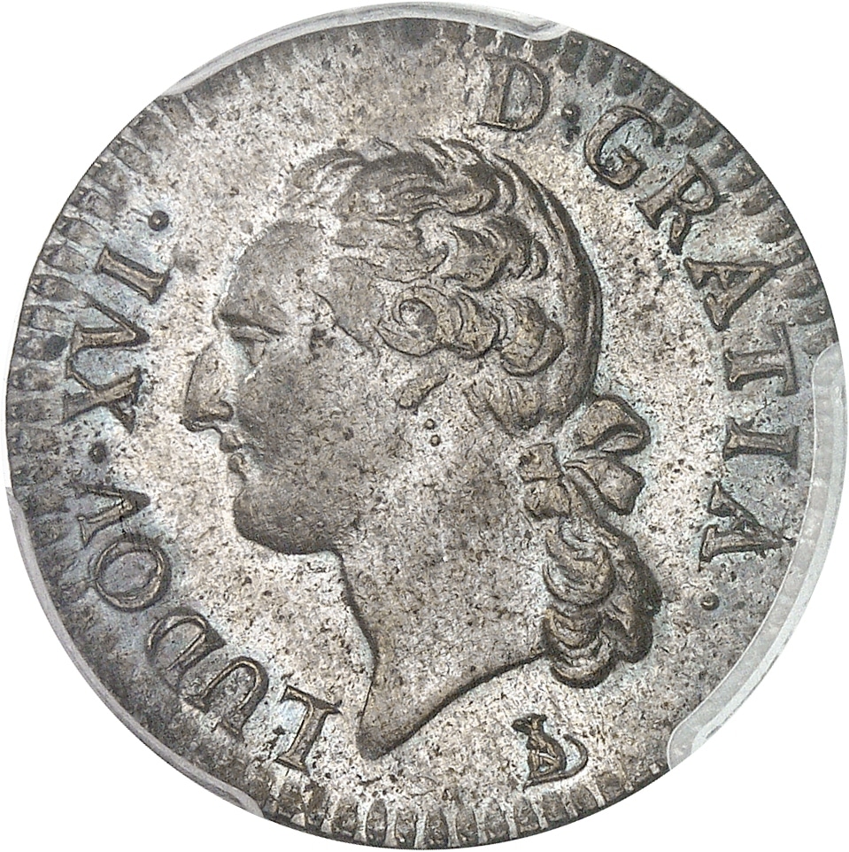 Av. LUDOV. XVI. D. GRATIA. Tête nue du Roi à gauche, les cheveux noués sur la nuque par un ruban ; au-dessous (différent).