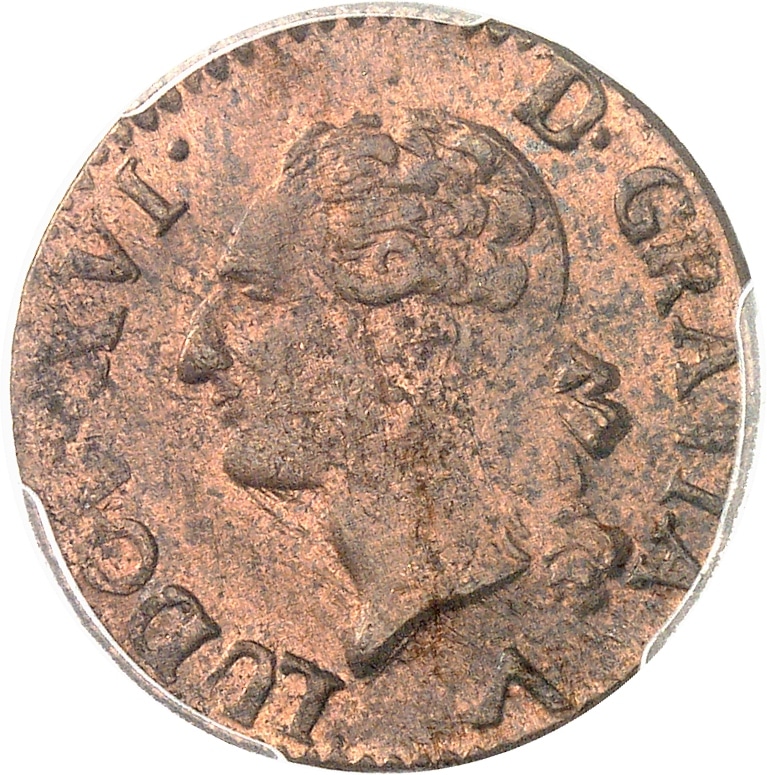 Av. LUDOV. XVI. D. GRATIA. Tête nue du Roi à gauche, les cheveux noués sur la nuque par un ruban ; au-dessous, (différent).