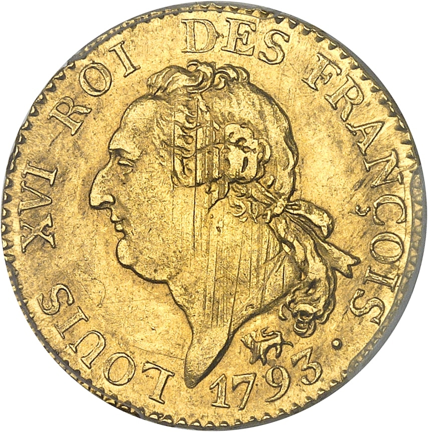 PCGS AU58 (55951648). Millésime rare, et contemporain de l’exécution du Roi. De minimes stries d’ajustage au droit. L’usure est régulière sur les reliefs avec seulement de petites marques dans les champs. Le brillant d’origine reste visible sous une délicate patine. Superbe.