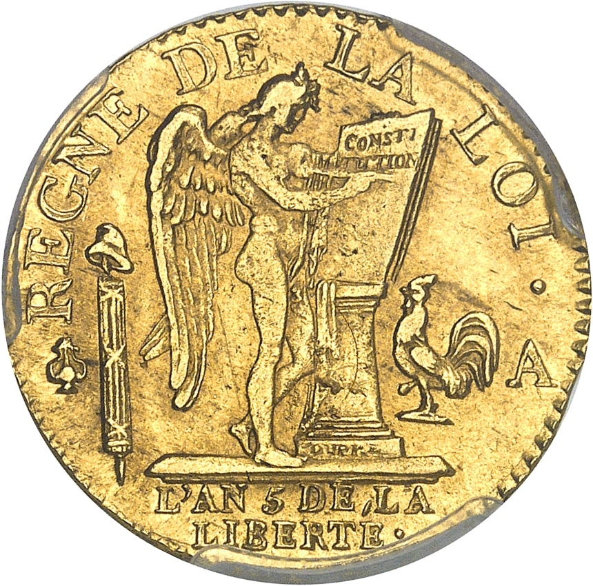 Rv. REGNE DE LA LOI. Le Génie de la France gravant le mot CONSTITUTION (en deux lignes) sur une table de la loi reposant sur un autel, accosté du (différent) et d’un faisceau à gauche, d’un coq et (atelier) à droite. Signature DUPRÉ en creux sur la base de l’autel. À l’exergue : L’AN (date) DE LA LIBERTÉ en deux lignes.