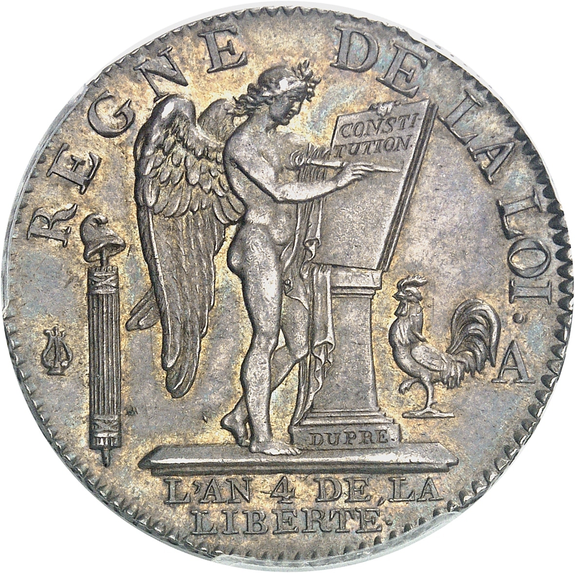Rv. REGNE DE LA LOI. Le Génie de la France gravant le mot CONSTITUTION (en deux lignes) sur une table de la loi reposant sur un autel, accosté du (différent) et d’un faisceau à gauche, d’un coq et (atelier) à droite. Signature DUPRÉ en creux sur la base de l’autel. À l’exergue : L’AN (date) DE LA LIBERTÉ en deux lignes.