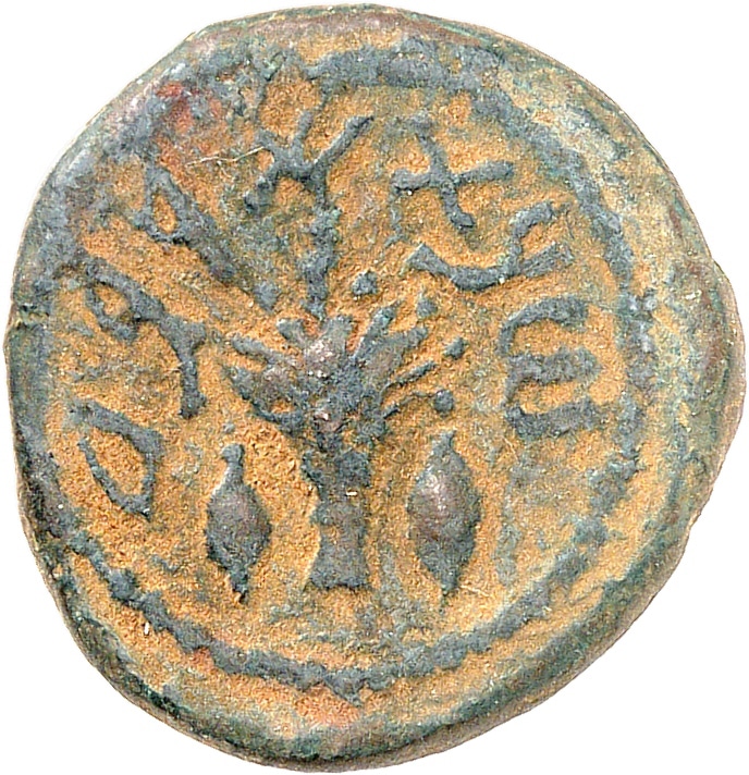 Rv. Légende hébraïque “An (date)”. Le loulav (feuille de palmier-dattier) avec à sa gauche et à sa droite un etrog (cédrat).