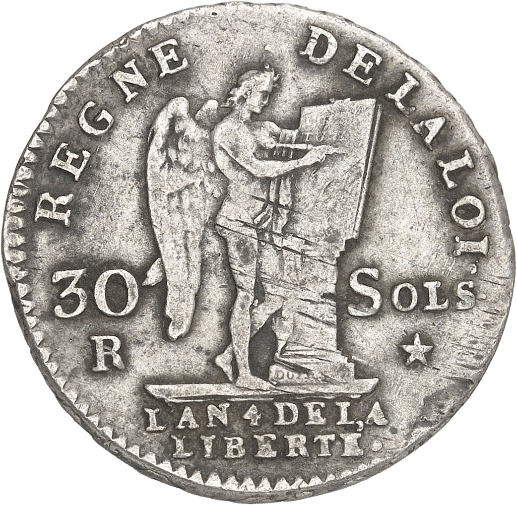 Rv. REGNE DE LA LOI. Le Génie de la France gravant le mot CONSTITUTION (en deux lignes) sur une table de la loi reposant sur un autel, accosté de 30 et (atelier) à gauche, de SOLS et (différent) à droite. Signature cursive DUPRÉ en creux sur la base de l’autel. À l’exergue : L’AN (date) DE LA LIBERTÉ en deux lignes.