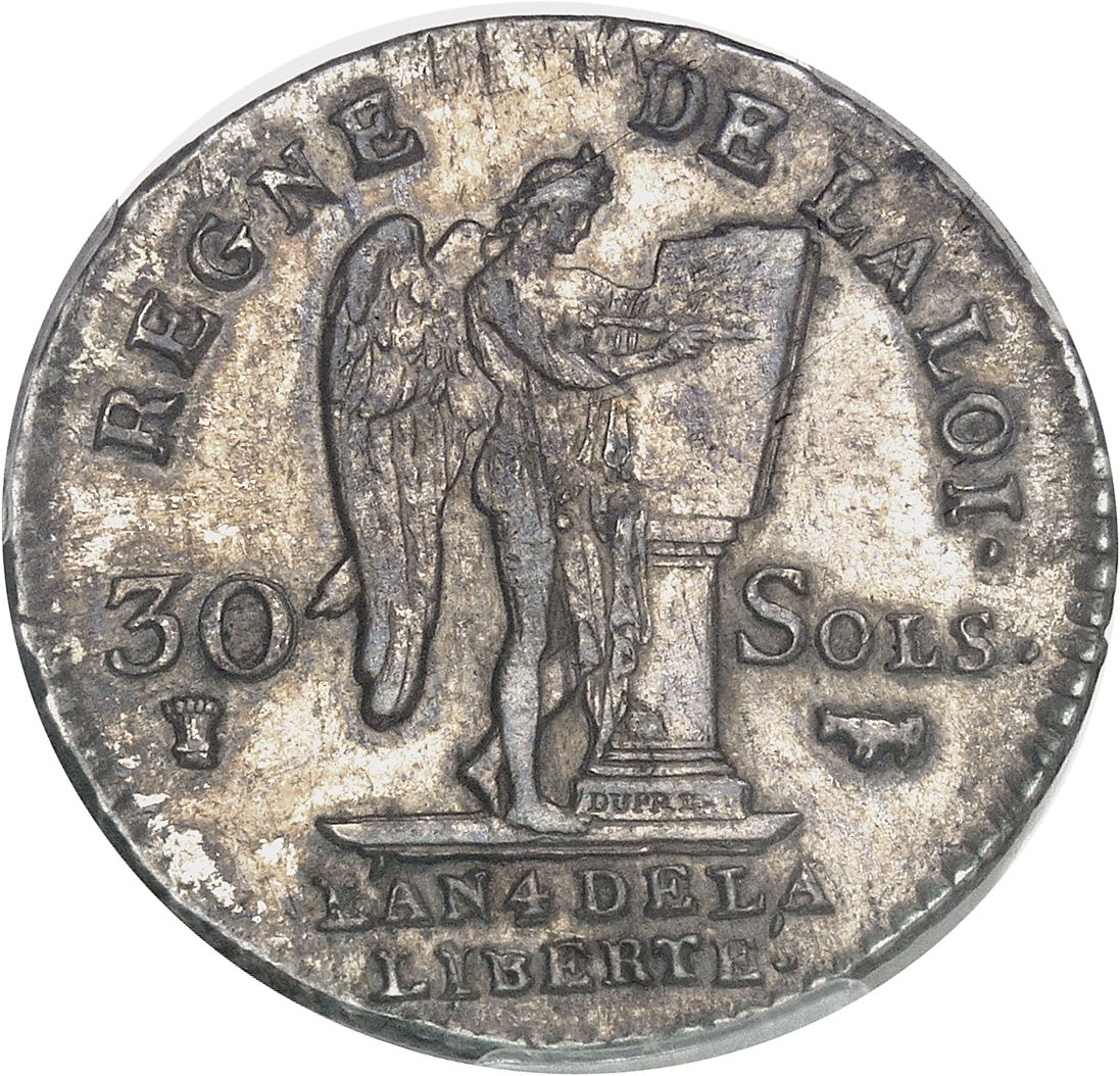 Rv. REGNE DE LA LOI. Le Génie de la France gravant le mot CONSTITUTION (en deux lignes) sur une table de la loi reposant sur un autel, accosté de 30 et (différent) à gauche, de SOLS et (atelier) à droite. Signature cursive DUPRÉ en creux sur la base de l’autel. À l’exergue : L’AN (date) DE LA LIBERTÉ en deux lignes.