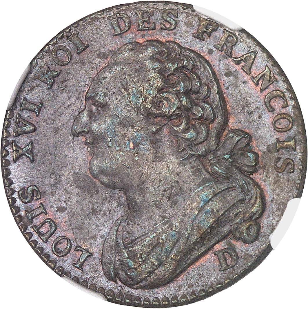 Av. LOUIS XVI ROI DES FRANCOIS. Buste drapé à gauche du Roi, la tête nue, les cheveux noués par un ruban sur la nuque, signature DUVIVIER. Au-dessous (atelier).