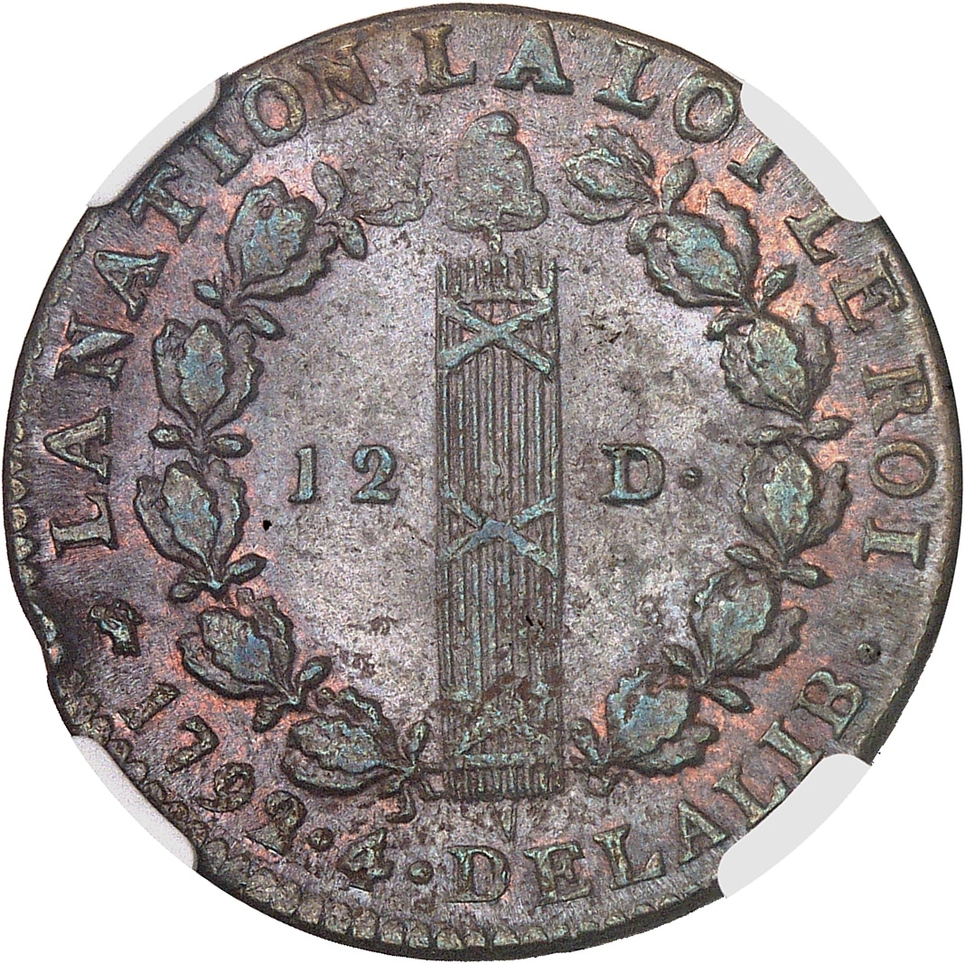 Rv. (différent) LA NATION LA LOI LE ROI. Faisceau sommé d’un bonnet phrygien et accosté de 12 - D, entre deux branches de chêne. À l’exergue : (date). (An). DE LA LIB.