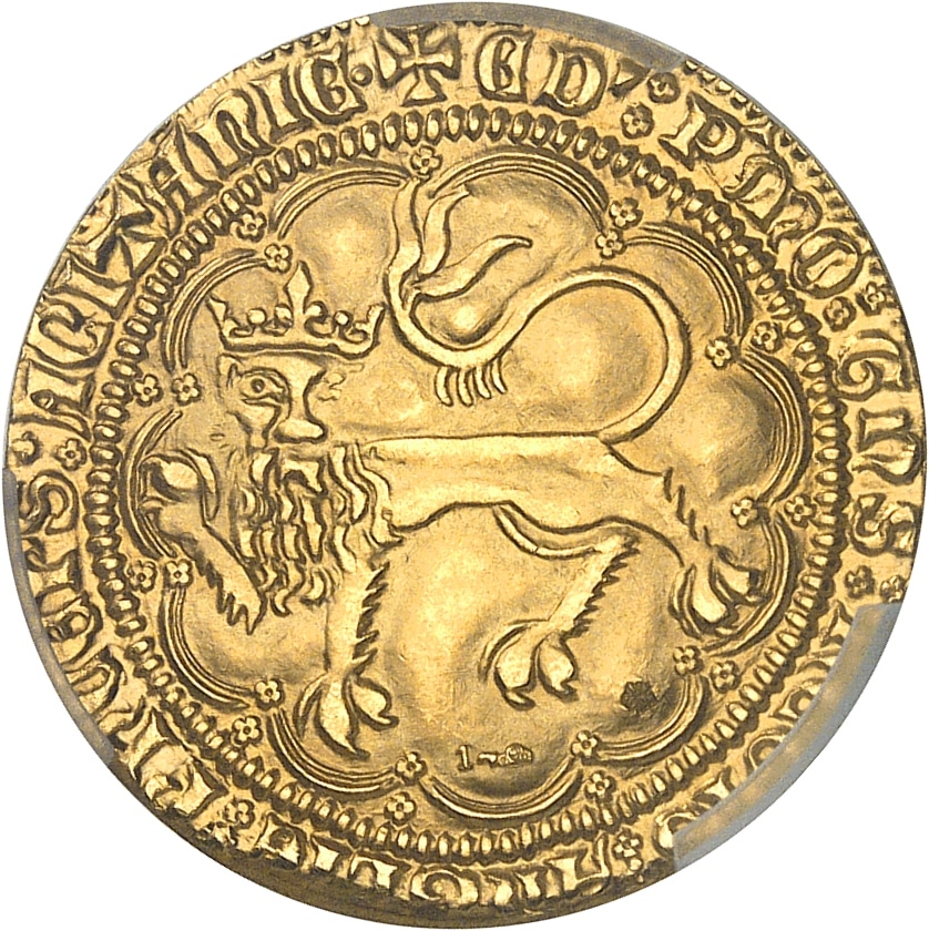 PCGS MS69 (59830063). Refrappe de la fin du XXe siècle par la Monnaie de Paris du célèbre léopard d’or du Prince noir, duc d’Aquitaine, au titre de 920/1000 (poinçon corne 1 à l’avers). Très haut grade. Fleur de coin.