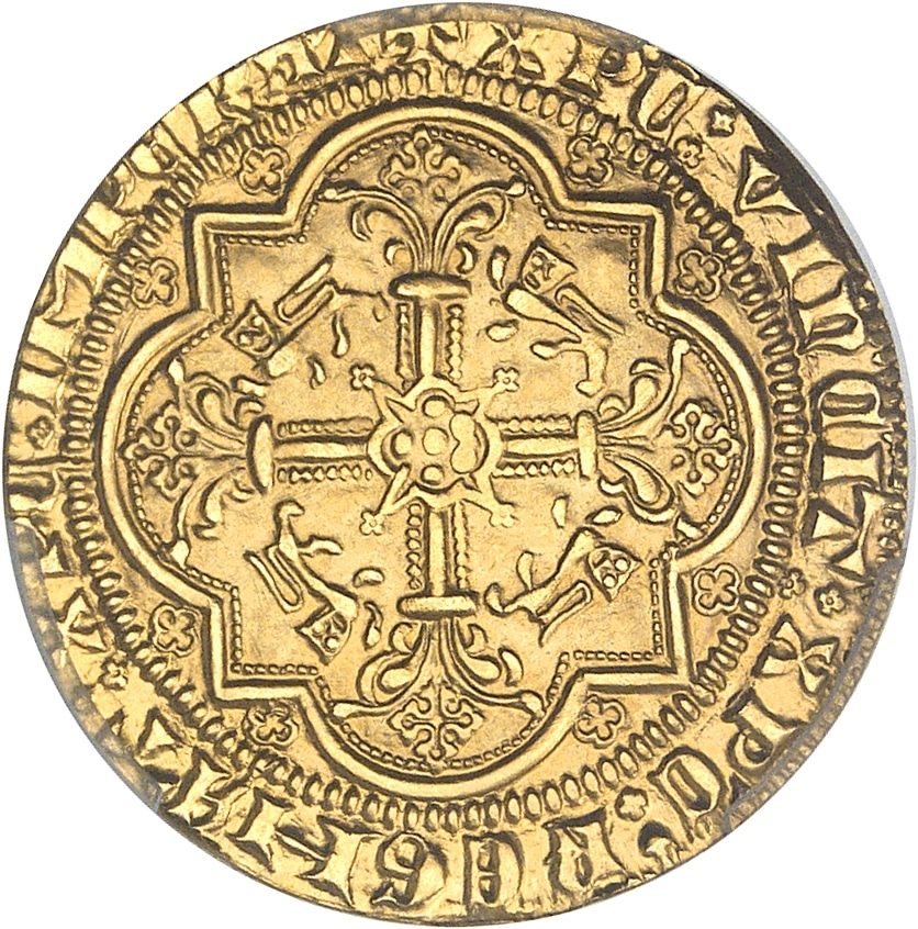 Rv. + XPC: VINCIT: XPC: REGNAT: XPC: IMPERAT. Croix feuillue cantonnée de quatre léopards, dans un quadrilobe anglé.