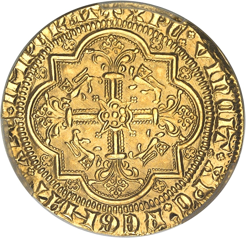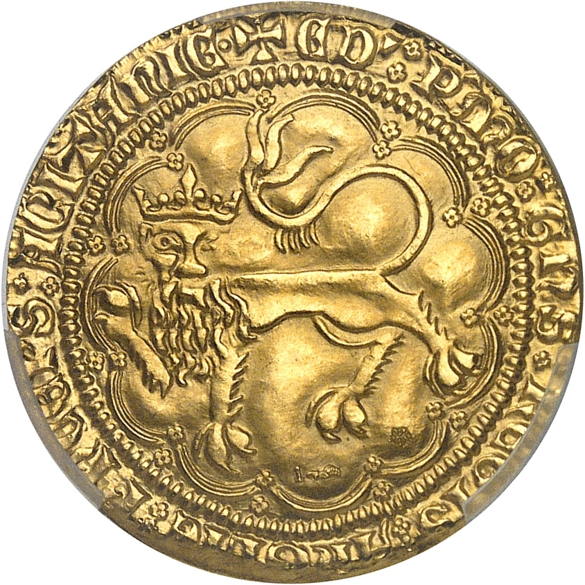 PCGS MS68 (50931318). Refrappe de la fin du XXe siècle par la Monnaie de Paris du célèbre léopard d’or du Prince noir, duc d’Aquitaine, au titre de 920/1000 (poinçon corne 1 à l’avers). Très haut grade. Fleur de coin.