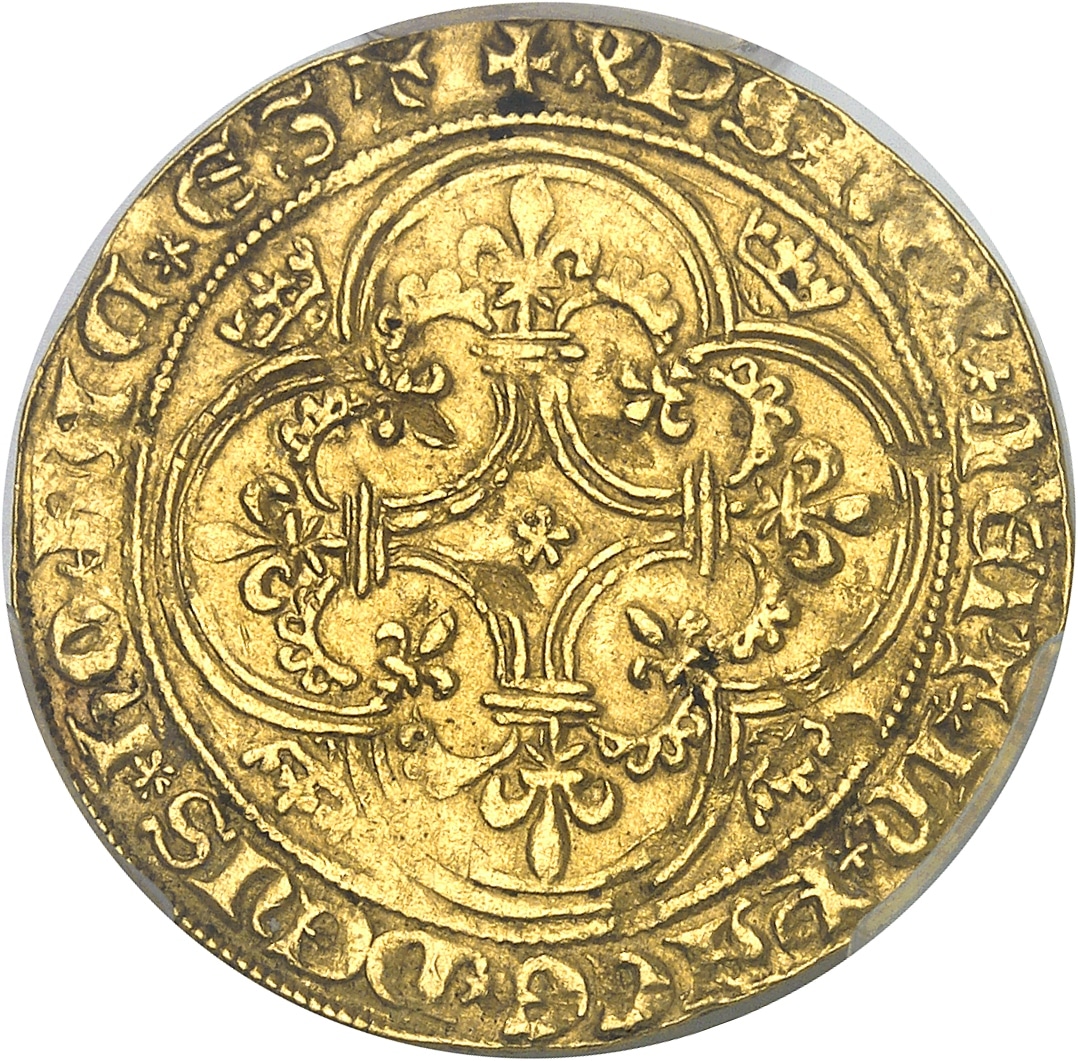 Rv. + XPS* REX* VEIT* IN* PACE* DEVS* HO* FAC* EST. Dans un quadrilobe cantonné de quatre couronnelles et anglé de quatre lis, croix arquée, feuillue et fleurdelisée, avec rosette en cœur.