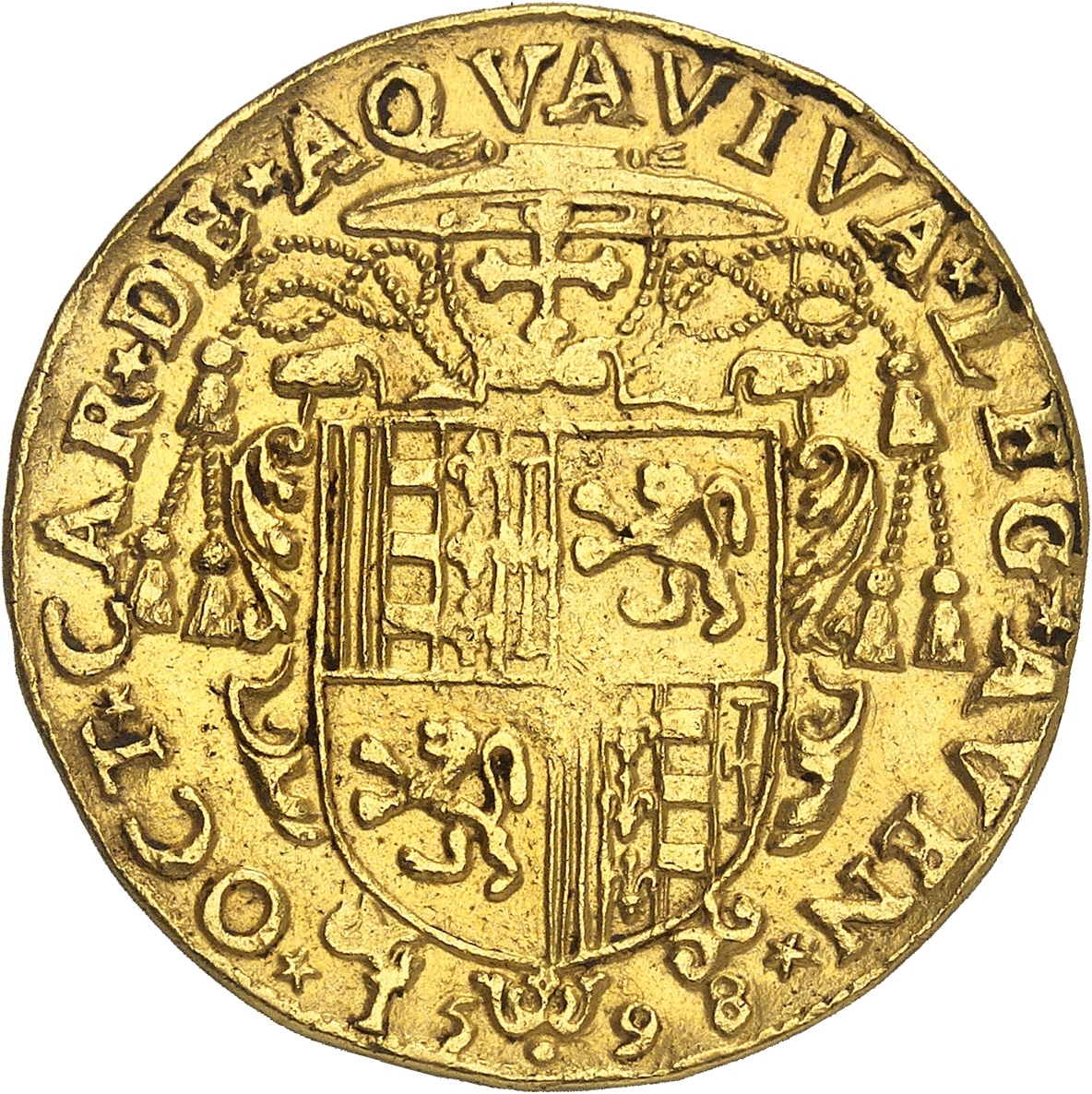 - FRANCE / FEUDAL Comtat Venaissin, Clément VIII (1592-1605). Quadruple écu d’or, avec le cardinal Octave d’Acquaviva, légat 1598, Avignon.