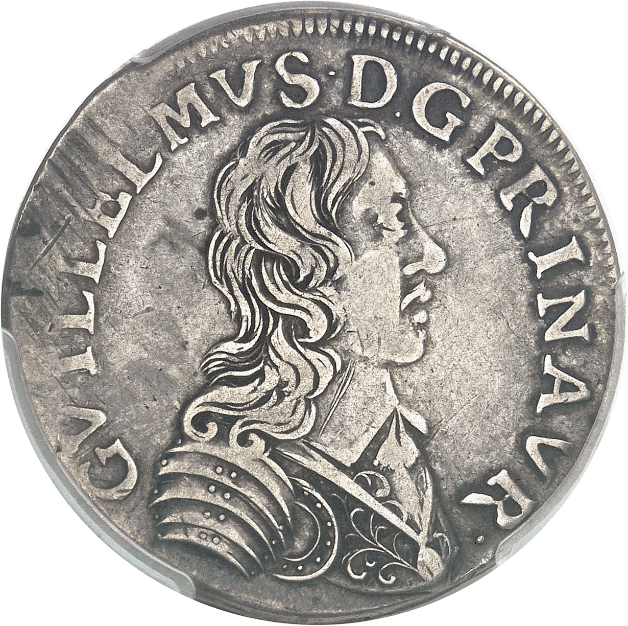 Av. GVILLELMVS. D: G. PRIN. AVR. Buste cuirassé, avec un col plat, à droite.