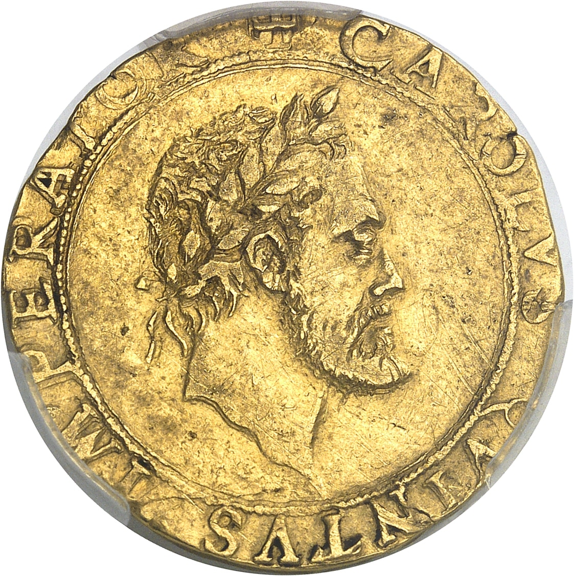 Av. (à 12 h) + CAROLVS. QVINTVS. IMPERATOR. Buste lauré à droite de Charles Quint.
