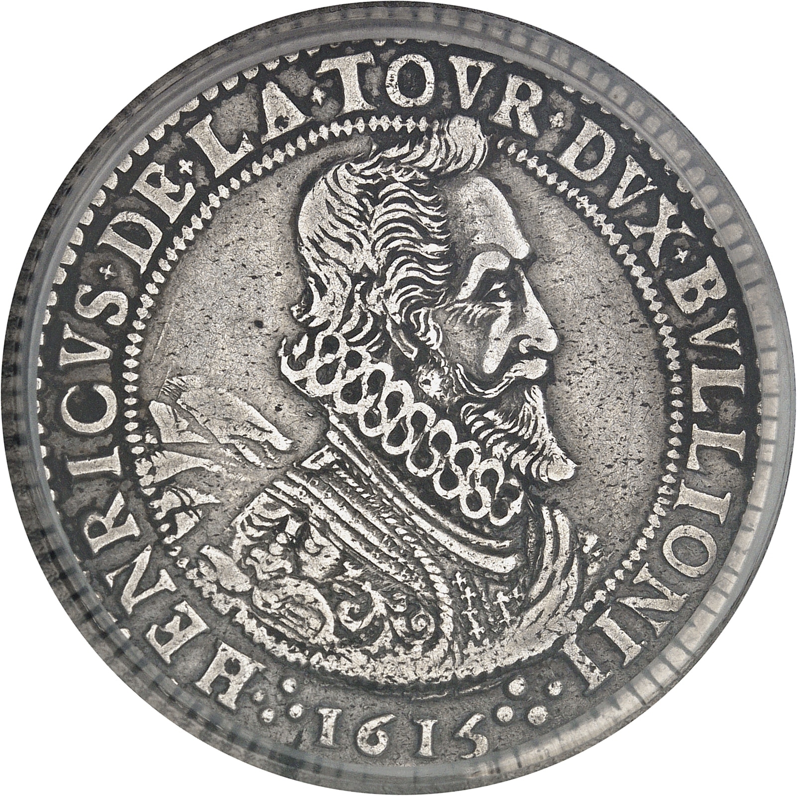 Av. (à 7 h) HENRICVS+ DE+ LA+ TOVR+ DVX+ BVLLIONII. Buste cuirassé à droite, avec large fraise et écharpe flottante derrière ; au-dessous ·:· (date)·:·.