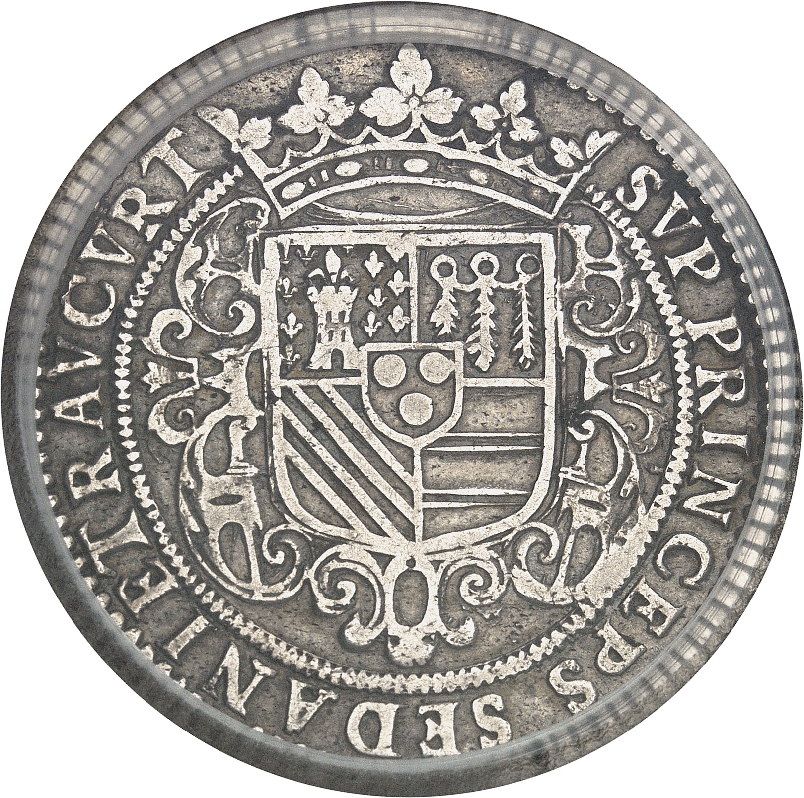 Rv. SVP PRINCEPS. SEDANI ET RAVCVRT. Écu orné de cuirs, sommé d'une couronne ducale, écartelé aux 1 de la Tour d'Auvergne, au 2 d'Auvergne, au 3 de Turenne et au 4 de Bouillon, sur le tout de Boulogne.