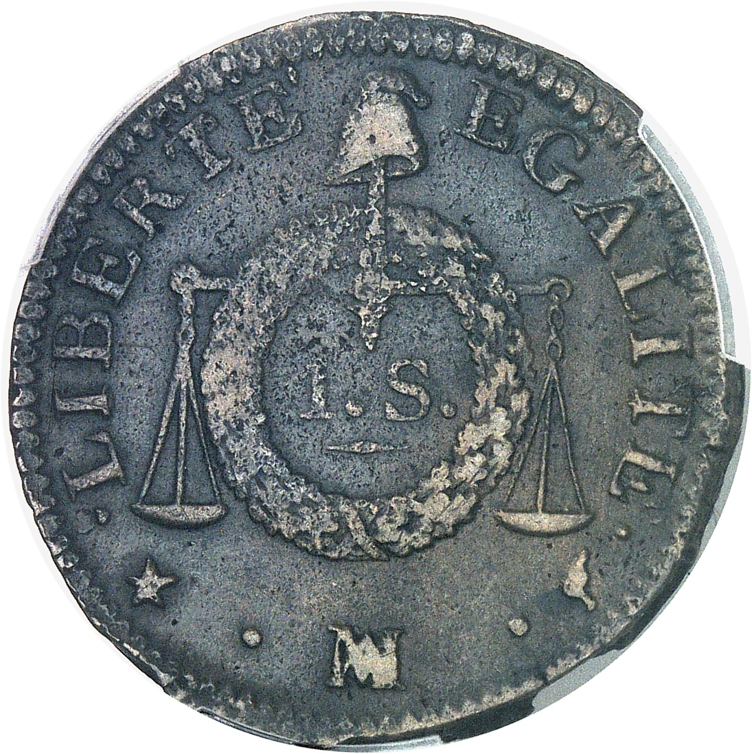 Rv. LIBERTE EGALITE. Fléau d’une balance surmonté d’un bonnet de la liberté, sur lequel est une couronne avec au centre : 1. S ; au-dessous (atelier) et (différents).