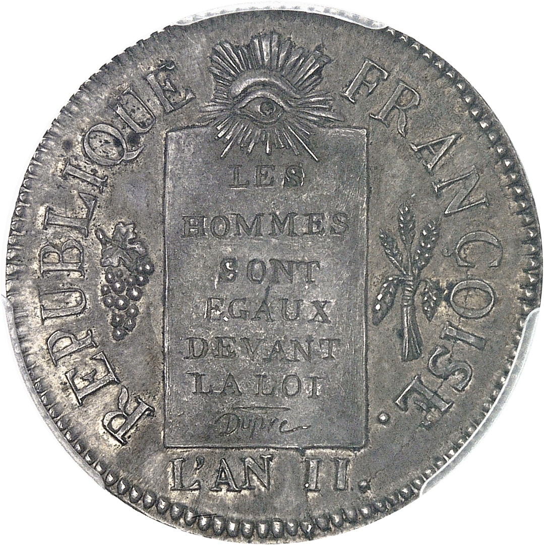 Av. REPUBLIQUE - FRANÇOISE / L’AN (date). Table inscrite LES HOMMES SONT EGAUX DEVANT LA LOI et signature Dupré, sous un œil rayonnant et entre une grappe et des épis.
