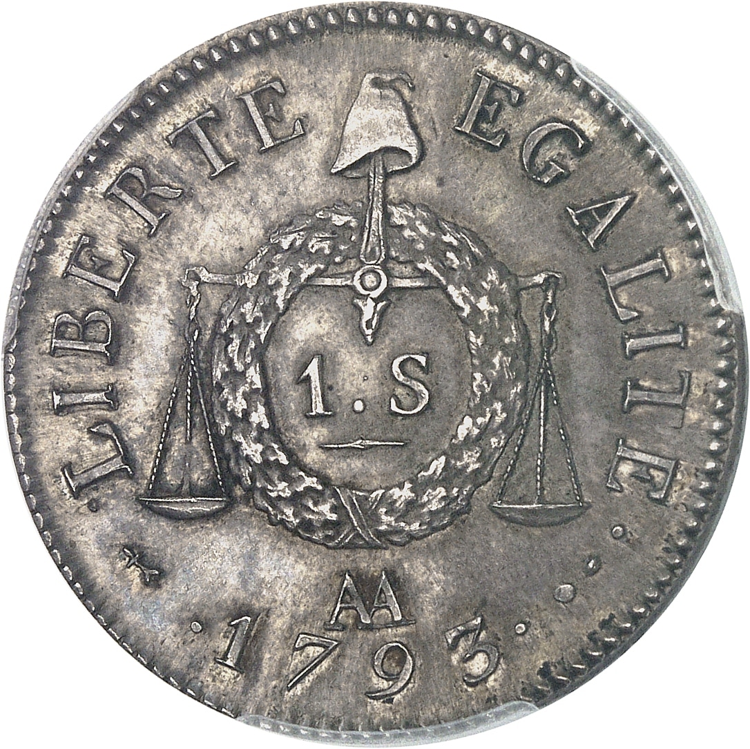 - Convention (1792-1795). Sol à la balance FRANÇOISE, refrappe postérieure sur flan en argent 1793 - An II (c.1838 ?), AA, Metz.