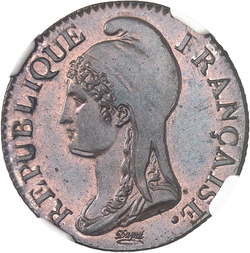 Av. REPUBLIQUE FRANÇAISE. Buste de la République à gauche, coiffée d’un bonnet de la liberté ; au-dessous signature cursive Dupré.