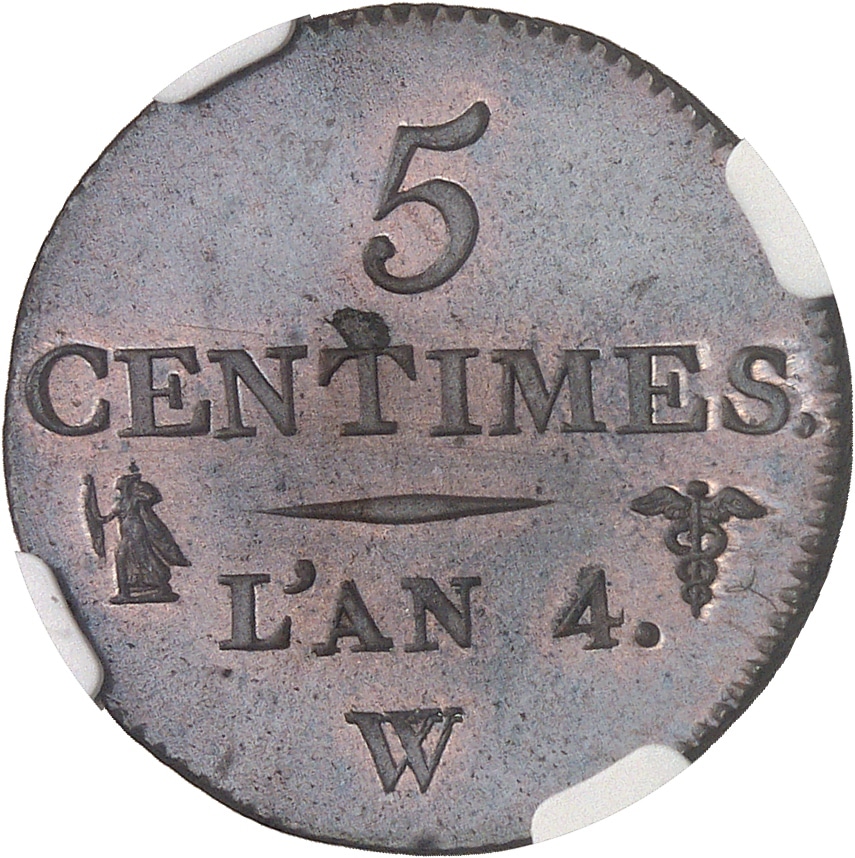 - Directoire (1795-1799). Cinq centimes Dupré, petit module An 4 (1795), W, Lille.
