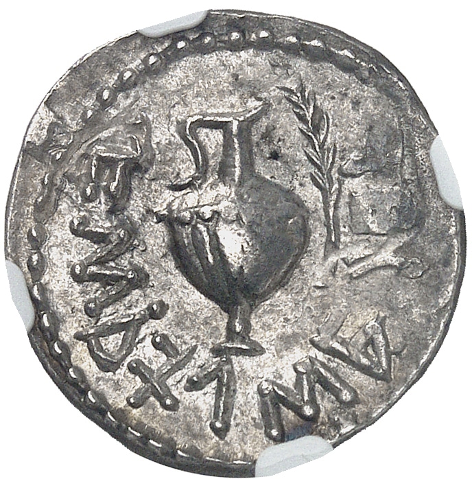 Rv. Légende hébraïque “An (date) de la liberté d’Israël”. Cruche à droite, avec une palme, le tout dans un grènetis.