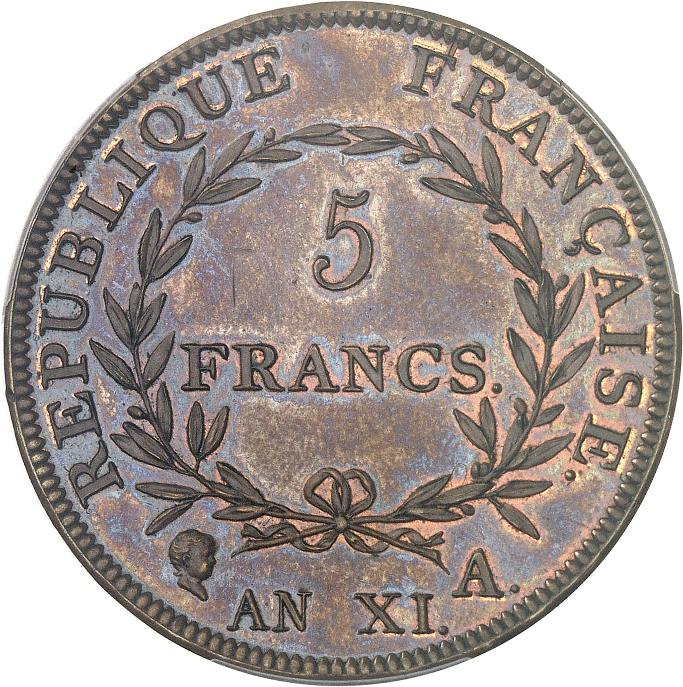Rv. REPUBLIQUE FRANCAISE. Dans une couronne formée de deux branches de laurier : 5 FRANCS et au-dessous (tête d’enfant) AN XI et (atelier).